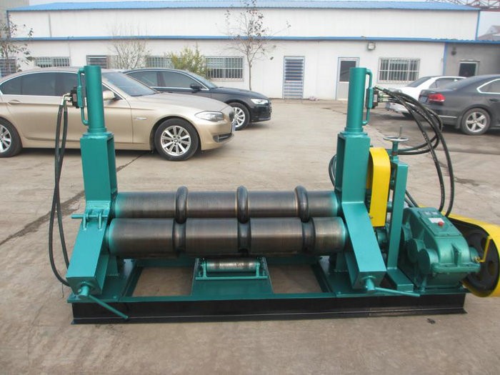 該機結構形式為三輥非對稱式。側輥在兩直列輥中間對稱位置作平衡升降運動,通過絲杠、絲母而獲得,兩直列輥作旋轉夾緊送料運動,通過減速機的輸出齒輪與下輥齒輪嚙合,實現(xiàn)板材的行走。當側輥輥的下壓力超過材料的屈服限度時,便使所卷制的材料變形,從而達到卷制直徑達大?。?br /> 三、技術參數(shù)